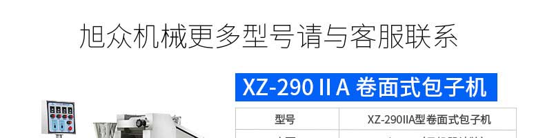 名称XZ-290A智能卷式包子机 电源220/380v 功率3.3kw 产量0-36000个/h 尺寸2680*1500*1420mm 重量420kg 规格 其他