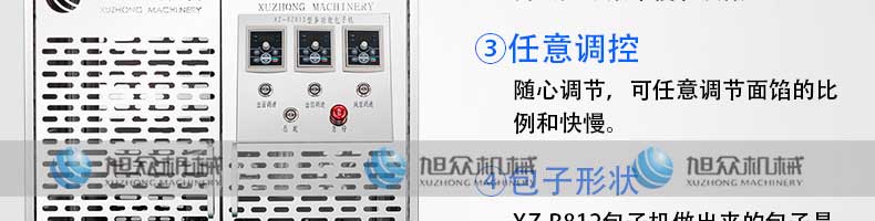 XZ-B812型多功能包子机,它能做的比你想象的多,可生产各种肉包、肉菜包、菜包、小笼包、汤包、生煎包、水晶包、圆馒头、奶黄包、豆沙包、叉烧包南瓜饼等几十种包馅制品。