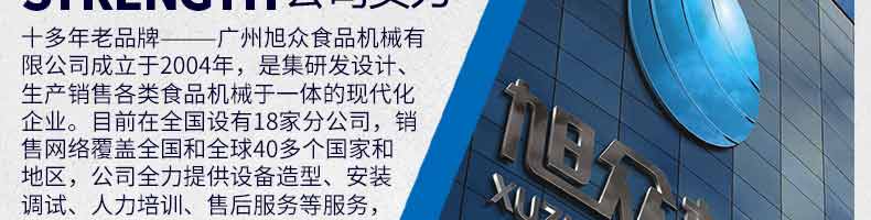 广州旭众食品机械有限公司是一家集科研开发,生产设计,营销服务为一体的现代化生产企业。现代化生产车间,精湛制造技术,所产机械历经市场重重考验,不断赢得海内外客户的赞誉。