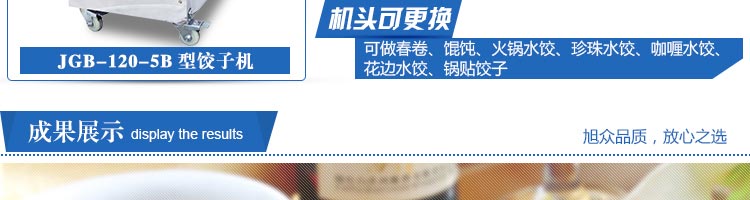 JGB-120-5B型饺子机,本机是一款可生产各种肉馅、肉菜混合馅、全菜馅及其他种馅饺子的设备。一机多用途,只要更换模具,就可制作不同的食品,如春卷、馄饨、咖喱角、锅贴等。适用于宾馆、饭店、餐厅、团体食堂加工,幼儿园、速冻饺子生产。