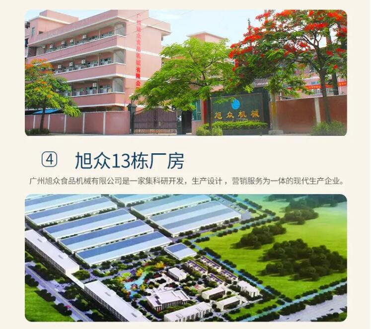 广州旭众食品机械有限公司是一家集科研开发,生产设计,营销服务为一体的现代化生产企业。现代化生产车间,精湛制造技术,所产机械历经市场重重考验,不断赢得海内外客户的赞誉。