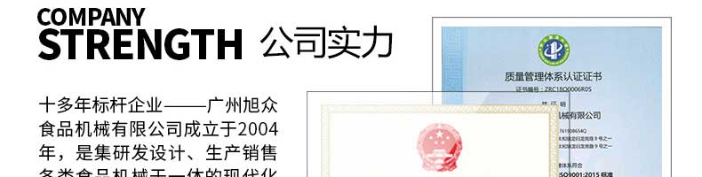 广州旭众食品机械有限公司是一家集科研开发,生产设计,营销服务为一体的现代化生产企业。现代化生产车间,精湛制造技术,所产机械历经市场重重考验,不断赢得海内外客户的赞誉。
