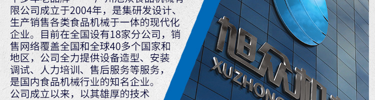 广州旭众食品机械有限公司是一家集科研开发,生产设计,营销服务为一体的现代化生产企业。现代化生产车间,精湛制造技术,所产机械历经市场重重考验,不断赢得海内外客户的赞誉。